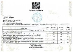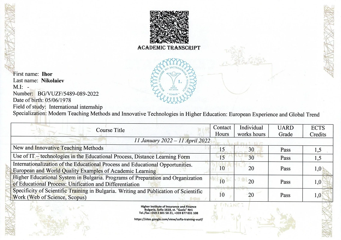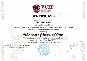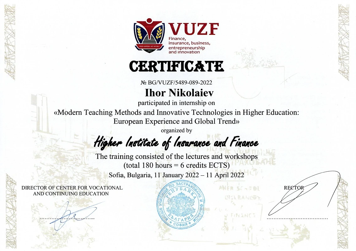 11.01.2022 – 11.04.2022 – Higher Institute of Insurance and Finance (VUZF University of Finance, Business and Entrepreneurship), Sofia, Bulgaria, International internship on "Modern Teaching Methods and Innovative Technologies in Higher Education: European Experience and Global Trend" (“Сучасні методи навчання та інноваційні технології в вищій освіті: європейський досвід та глобальні тенденції”), certificate № BG/VUZF/5489-089-2022 (180 hours / 6 credits ECTS)