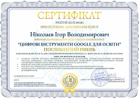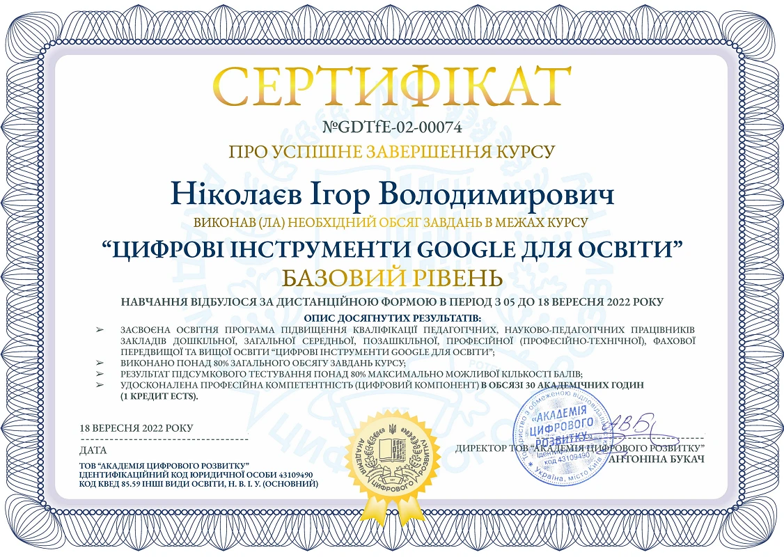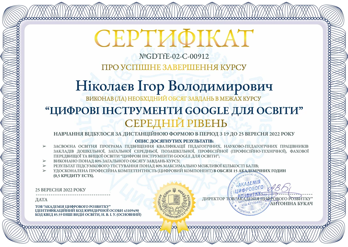 05.09.2022 р. – 02.10.2022 р. – ТОВ “Академія цифрового розвитку”, курс “Google Digital Tools for Education / Цифрові інструменти Google для освіти”, сертифікати: №GDTfE-02-00074 (базовий рівень) від 18.09.2022 р. (30 годин / 1 кредит ECTS), №GDTfE-02-С-00912 (середній рівень) від 25.09.2022 р. (15 годин / 0,5 кредити ECTS), №GDTfE-02-П-00484 (поглиблений рівень) від 02.10.2022 р. (15 годин / 0,5 кредити ЄКТС)