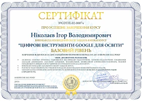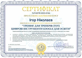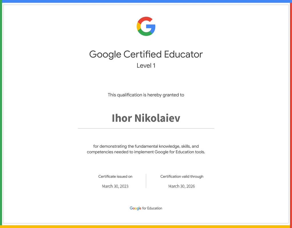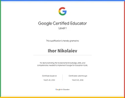 30.03.2023 р. по теперішній час – Google Certified Educator, Level 1 (сертифікат)