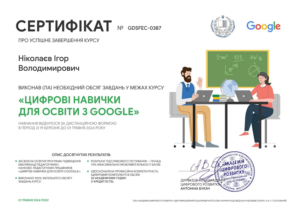 19.03.2024 р. – 01.05.2024 р. – Google та ТОВ “Академія цифрового розвитку”, курс “Цифрові навички для освіти з Google”, сертифікат № GDSFEC-0387 від 01.05.2024 р. (30 годин / 1 кредит ЄКТС)