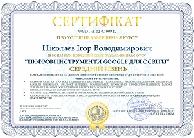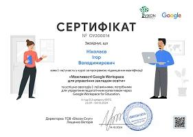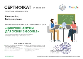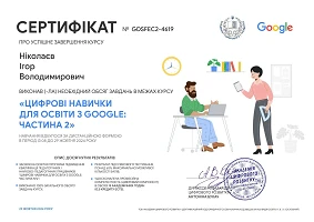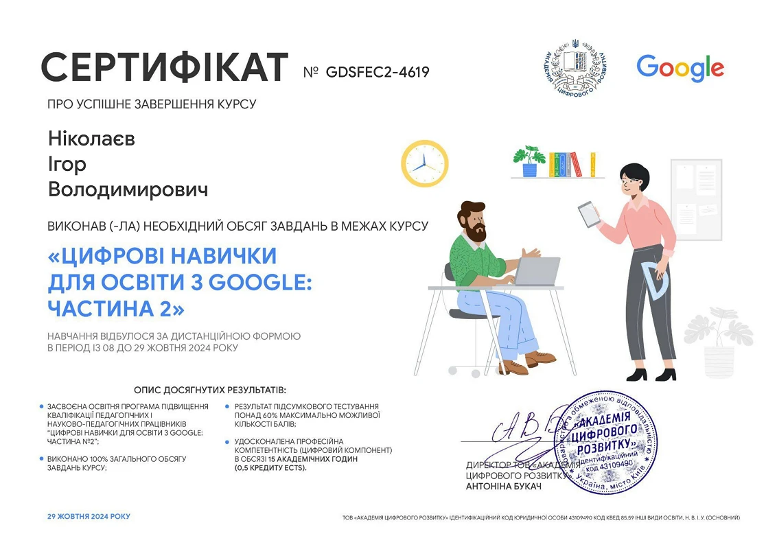 08.10.2024 р. – 29.10.2024 р. – Google та ТОВ “Академія цифрового розвитку”, курс “Цифрові навички для освіти з Google: Частина 2”, сертифікат № GDSFEC2-4619 від 29.10.2024 р. (15 годин / 0,5 кредити ЄКТС).