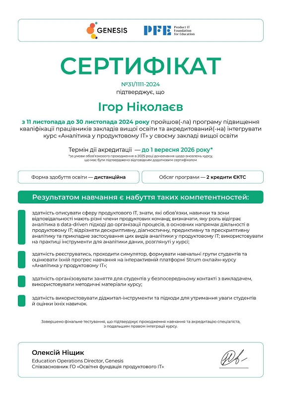 11.11.2024 р. – 30.11.2024 р. – Genesis, підвищення кваліфікації працівників закладів вищої освіти за курсом “Аналітика у продуктовому ІТ” (з акредитацією інтегрувати курс у своєму ЗВО), сертифікат № 31/1111-2024 від 02.12.2024 р. (60 годин / 2 кредити ЄКТС)