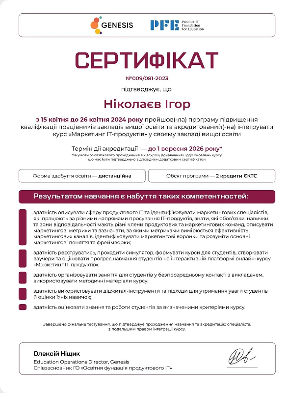 15.04.2024 р. – 26.04.2024 р. – Genesis, підвищення кваліфікації працівників закладів вищої освіти за курсом “Маркетинг ІТ продуктів” (з акредитацією інтегрувати курс у своєму ЗВО), сертифікат № 009/081-2023 від 08.05.2024 р. (60 годин / 2 кредити ЄКТС)