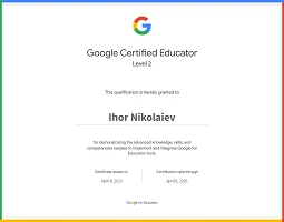 08.04.2023 р. по теперішній час – Google Certified Educator, Level 2 (сертифікат)
