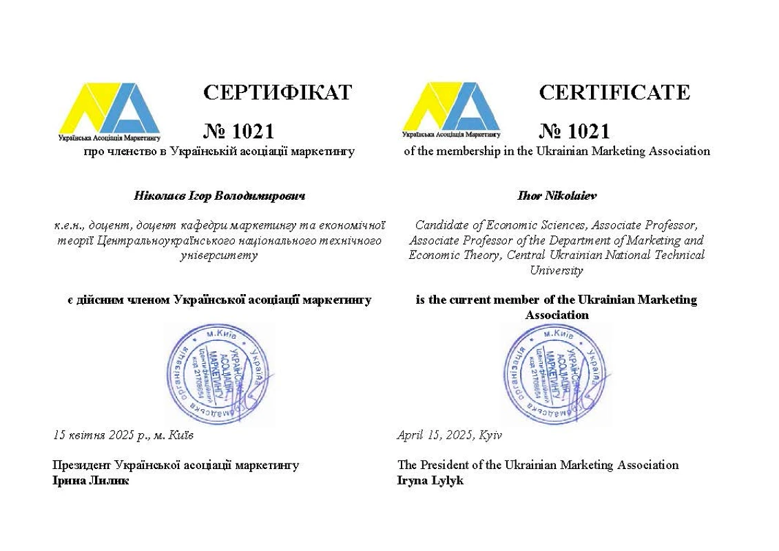 15.04.2025 р. по теперішній час – член Громадської організації “Українська Асоціація Маркетингу”, сертифікат № 1021 від 15.04.2025 р.