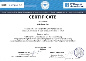 20.01.2025 р. – 07.02.2025 р. – EPAM, IT Асоціація України, стажування викладачів “AI-інструменти для освіти”, сертифікат № EPAMTI25324 від 11.02.2025 р. (60 годин / 2 кредити ЄКТС)