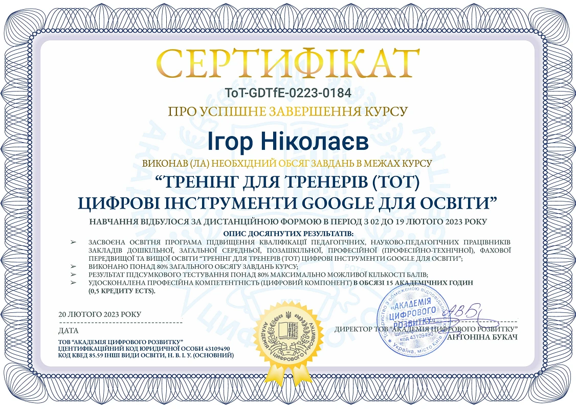 02.02.2023 р. – 19.02.2023 р. – ТОВ “Академія цифрового розвитку”, курс “Тренінг для тренерів / Training of Trainer”, сертифікат № ToT-GDTfE-0223-0184 від 20.02.2023 р. (15 годин / 0,5 кредити ЄКТС)