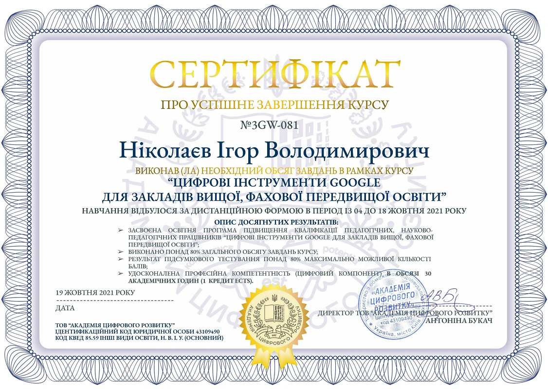 04.10.2021 р. – 18.10.2021 р. – ТОВ “Академія цифрового розвитку”, курс “Цифрові інструменти Google для закладів вищої, фахової передвищої освіти”, сертифікат № 3GW-081 від 19.10.2021 р. (30 годин / 1 кредит ЄКТС)
