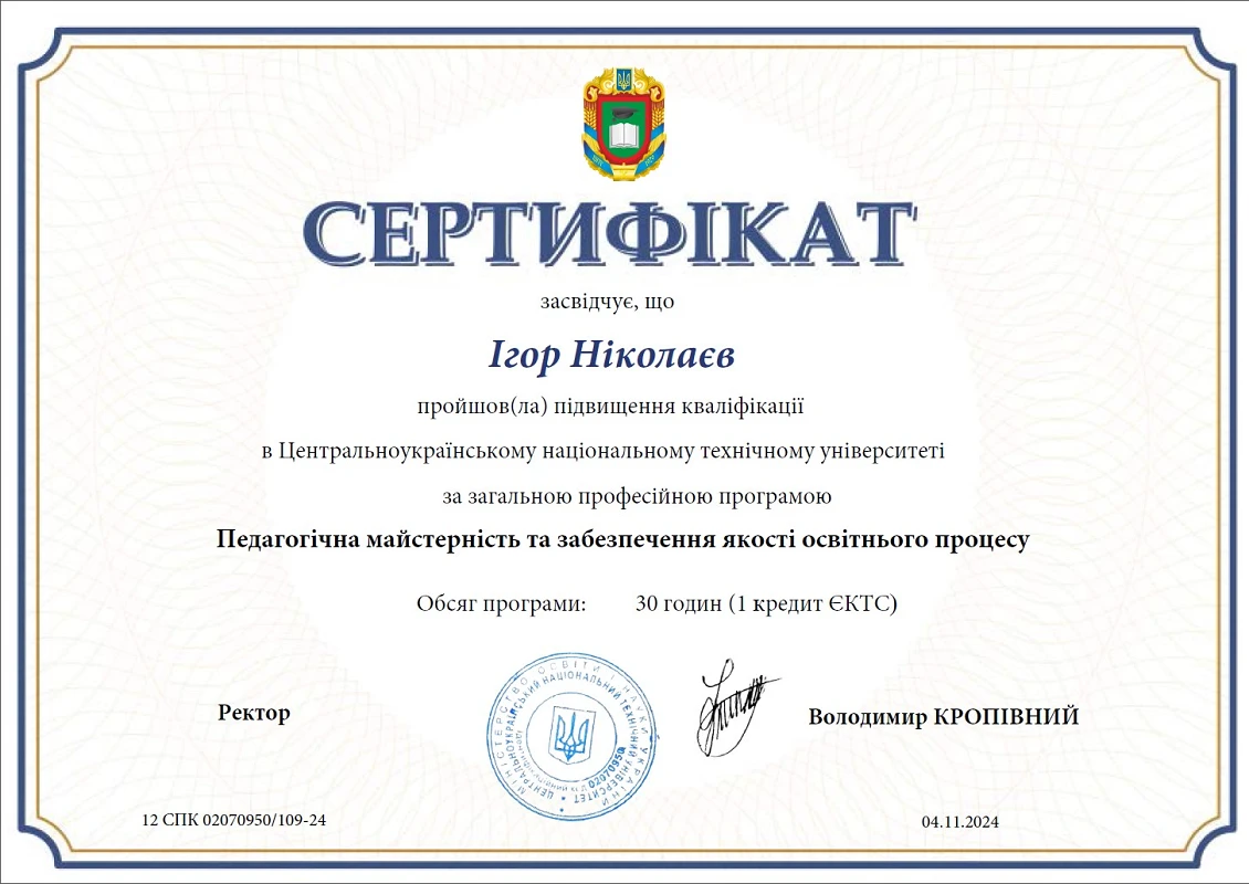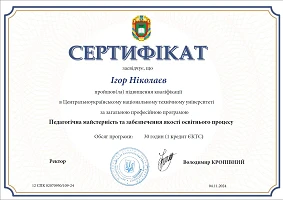 21.10.2024 р. – 02.11.2024 р. – ЦНТУ, підвищення кваліфікації НПП ЦНТУ “Педагогічна майстерність та забезпечення якості освітнього процесу”, сертифікат 12 СПК 02070950/109-24 від 04.11.2024 р. (30 годин / 1 кредит ЄКТС)