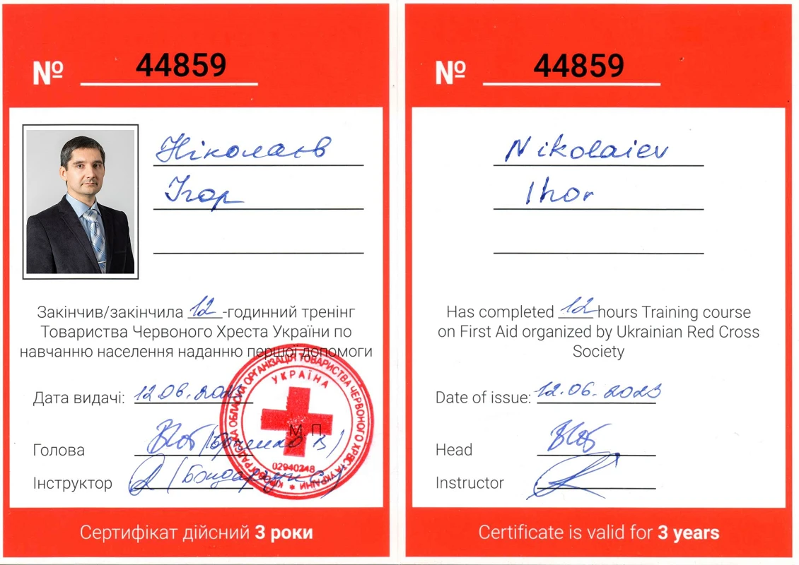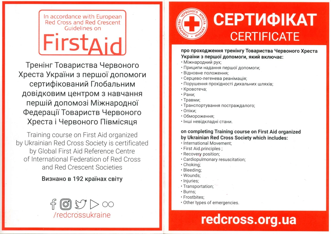 12.06.2023 р. – Товариство Червоного Хреста України, тренінг по навчанню населення наданню першої допомоги, сертифікат № 44859 від 12.06.2023 р. (12 годин / 0,4 кредити ЄКТС)