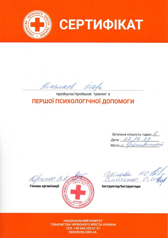 22.12.2023 р. – Товариство Червоного Хреста України, тренінг з першої психологічної допомоги, сертифікат від 22.12.2023 р. (6 годин / 0,2 кредити ЄКТС)