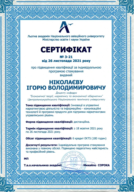 18.10.2021 р. – 26.11.2021 р. – Льотна академія Національного авіаційного університету, тема підвищення кваліфікації: “Інновації в управлінні маркетинговою діяльністю та інформаційно-комунікаційні технології й програмні продукти для підтримки маркетингових управлінських рішень”, сертифікат № 3-21 від 26.11.2021 р. (180 годин / 6 кредитів ЄКТС)