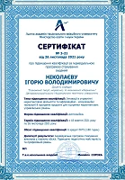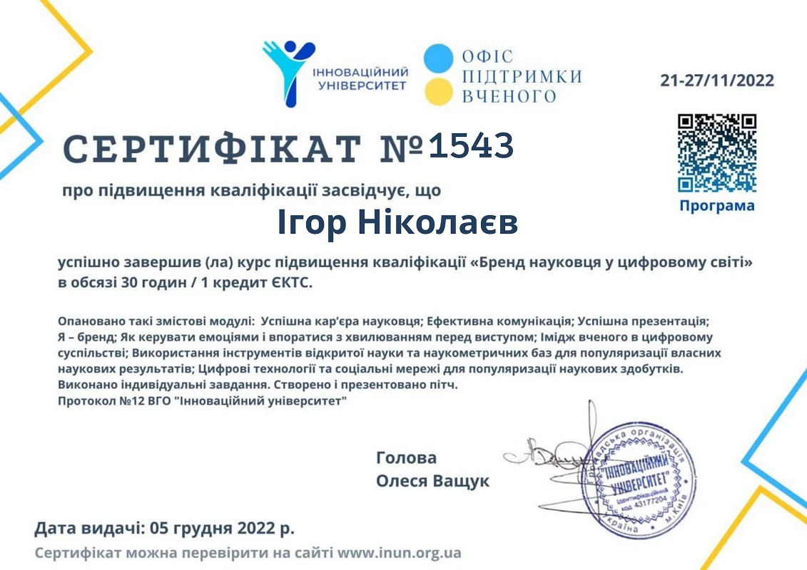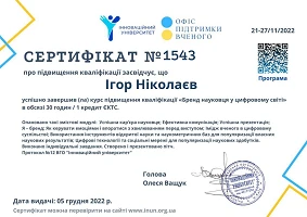 21.11.2022 р. – 27.11.2022 р. – ВГО “Інноваційний Університет”, Офіс підтримки вченого, курс “Бренд науковця у цифровому світі”, сертифікат №1543 від 05.12.2022 р. (30 годин / 1 кредит ЄКТС)
