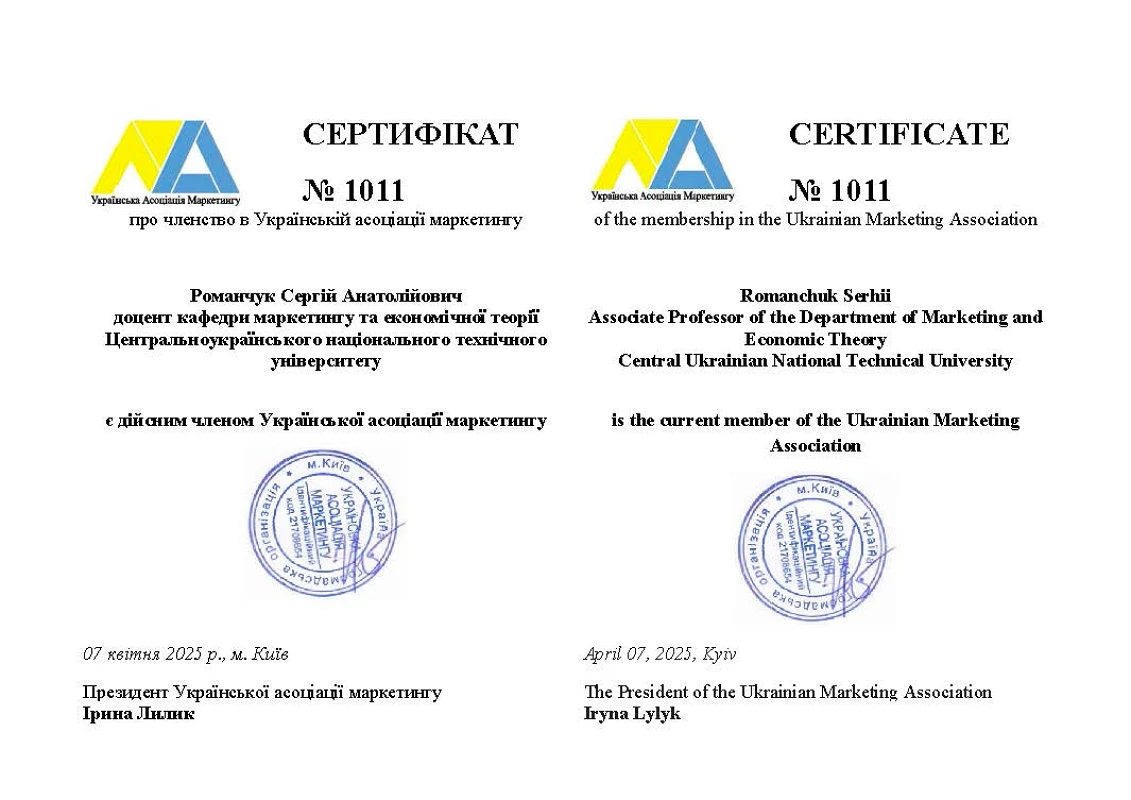 2020 р. – Національний університет "Запорізька політехніка", м. Запоріжжя, підвищення кваліфікації на кафедрі "Маркетинг та логістика", сертифікат № 153 від 24 грудня 2020 р. (180 годин / 6 кредитів ЄКТС)