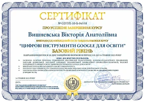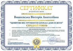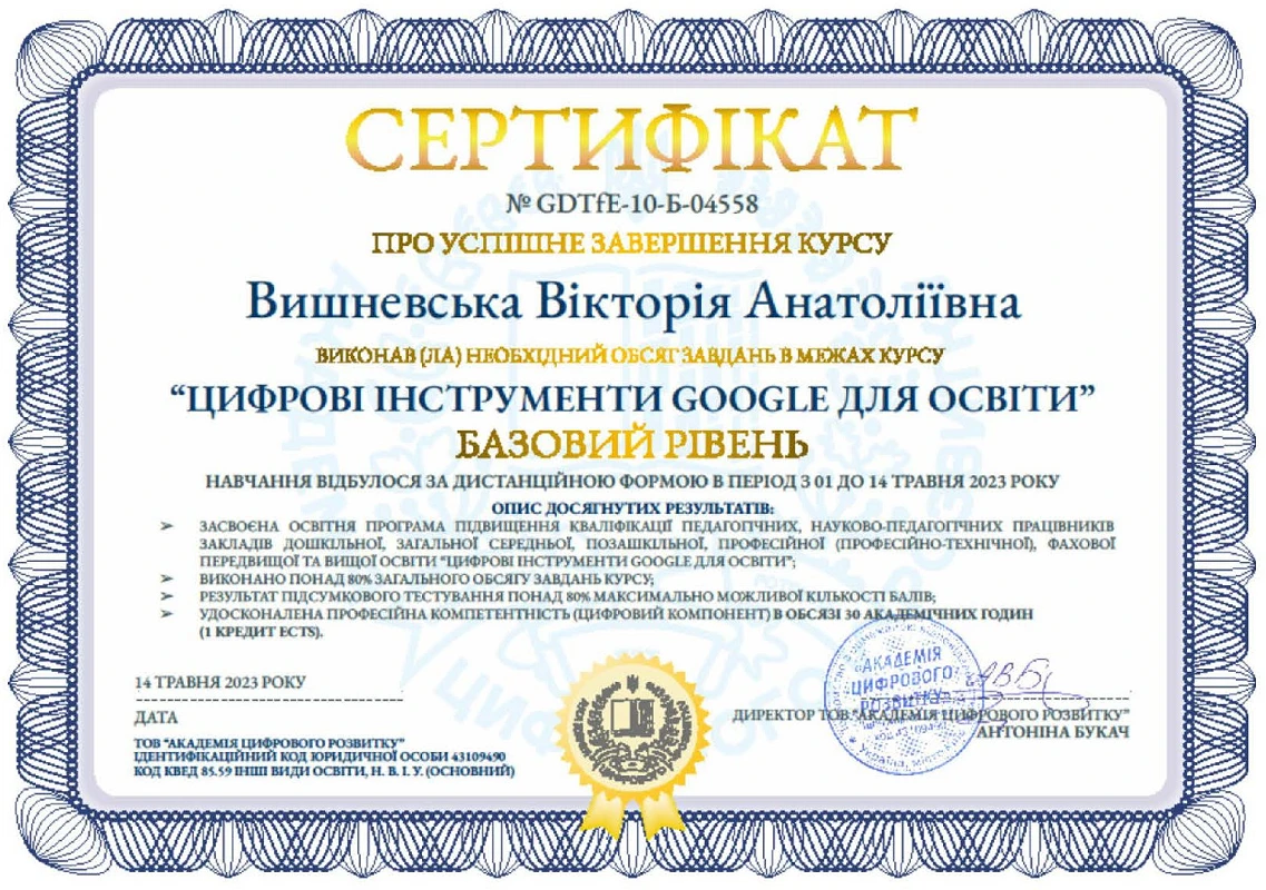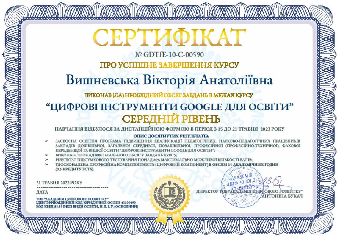 01.05.2023 р. – 21.05.2023 р. – ТОВ “Академія цифрового розвитку”, курс “Google Digital Tools for Education / Цифрові інструменти Google для освіти”, сертифікати: № GDTfE-10-Б-04558 (базовий рівень) від 14.05.2023 р. (30 годин / 1 кредит ECTS), № GDTfE-10-С-00590 (середній рівень) від 21.05.2023 р. (15 годин / 0,5 кредити ЄКТС)