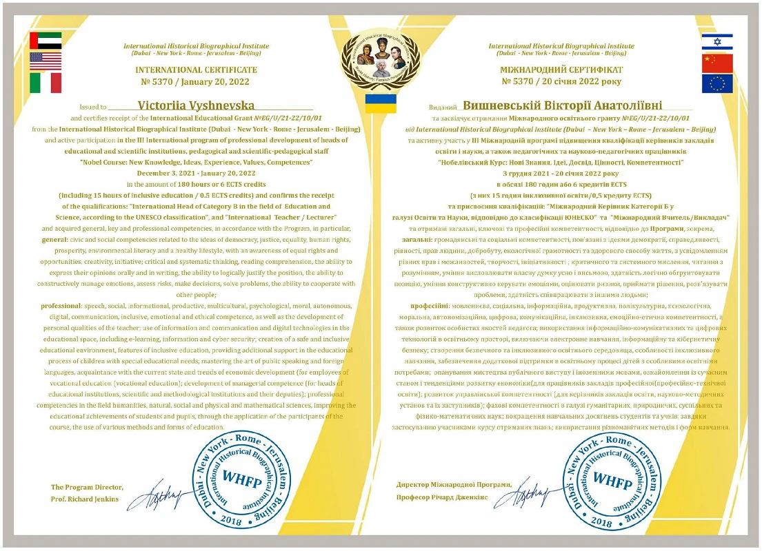 3.12.2021 р. – 20.01.2022 р. – III Міжнародна програма підвищення кваліфікації керівників закладів освіти і науки, а також педагогічних та науково-педагогічних працівників “Нобелівський Курс: Нові Знання, Ідеї, Досвід, Цінності, Компетентності”, міжнародний сертифікат №5370, 20 січня 2022 року (180 годин / 6 кредитів ЄКТС)