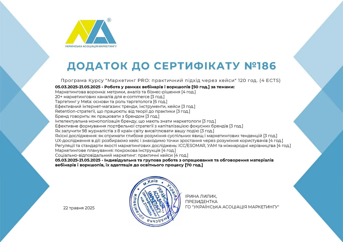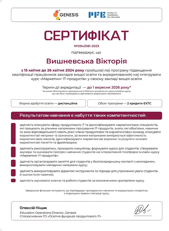 15.04.2024 р. – 26.04.2024 р. – GENESIS PFI, курс «Маркетинг у продуктовому ІТ». Сертифікат №094/081-2023 (60 годин / 2 кредити ЄКТС)