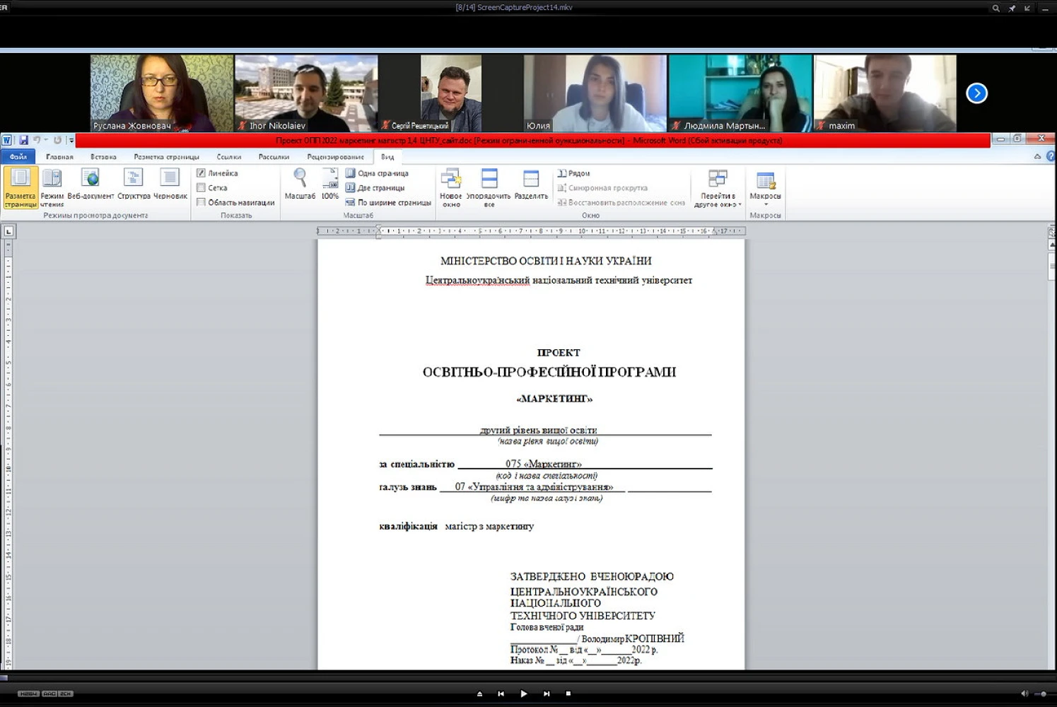 На кафедрі економічної теорії, маркетингу та економічної кібернетики Центральноукраїнського національного технічного університету в онлайн режимі для налагодження взаємодії освіти і ринку праці відбулося засідання Науково-методичної комісії спеціальності 075 «Маркетинг» із залученням стейкхолдерів освітньо-професійних програм першого (бакалаврського) та другого (магістерського) рівнів вищої освіти. Зокрема, у дискусії активну участь взяли гарант освітньо-професійної програми (ОПП) спеціальності 075 «Маркетинг» Руслана Жовновач і члени ради стейкхолдерів.