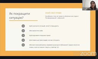 У рамках даного заходу, особливо цікавою стала просвітня лекція на тему: «Прозоре навчальне середовище» (дивитися) із роз’яснення стандартів доброчесності в закладі освіти, яка висвітлила наступні питання: виклики та досягнення вступної кампанії 2022 року, вдалі практики роботи антикорупційного уповноваженого ЗВО під час вступної кампанії, антикорупційна робота уповноваженого, прозоре навчальне середовище тощо. Організаторами наголошено, що кожен учасник освітнього процесу повинен розуміти свої права, вміти їх відстоювати та з повагою ставитися до прав інших учасників.