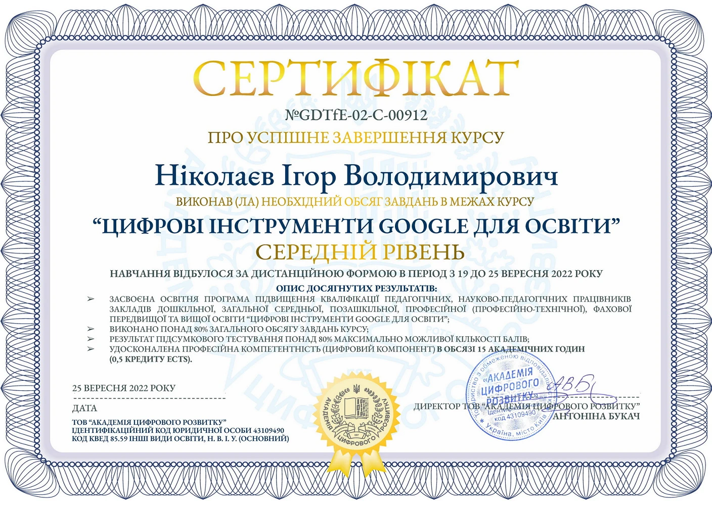 З 5 по 30 вересня 2022 року доцент кафедри економічної теорії, маркетингу та економічної кібернетики ЦНТУ Ігор Ніколаєв прийняв участь у 2-й сесії дистанційного навчання за програмою “Google Digital Tools for Education / Цифрові інструменти Google для освіти”. Організаторами навчання заради розширення можливостей використання цифрових інструментів для організації дистанційного навчання й підвищення ефективності освітнього процесу виступили Міністерство освіти і науки України за підтримки Google Україна.