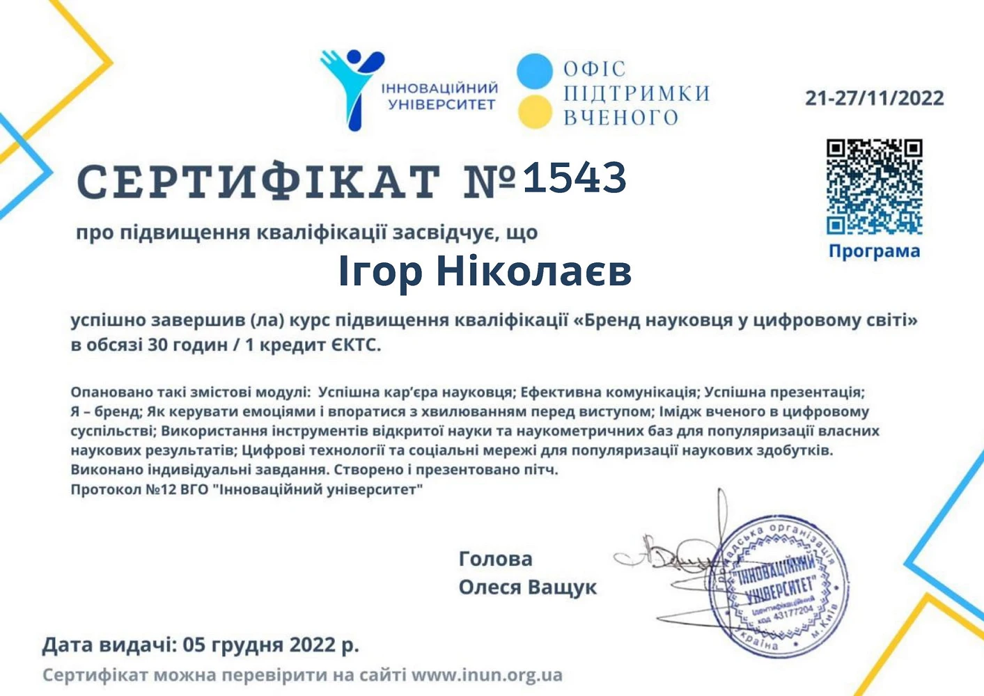 З 21 по 27 листопада 2022 року доцент кафедри економічної теорії, маркетингу та економічної кібернетики ЦНТУ Ігор Ніколаєв, проходив курс підвищення кваліфікації “Бренд науковця у цифровому світі” в онлайн форматі. За підсумками підвищення кваліфікації учасники отримали сертифікати в обсязі 30 годин (1 кредит ECTS). Такого цікавого та водночас складного курсу мабуть ще не було.